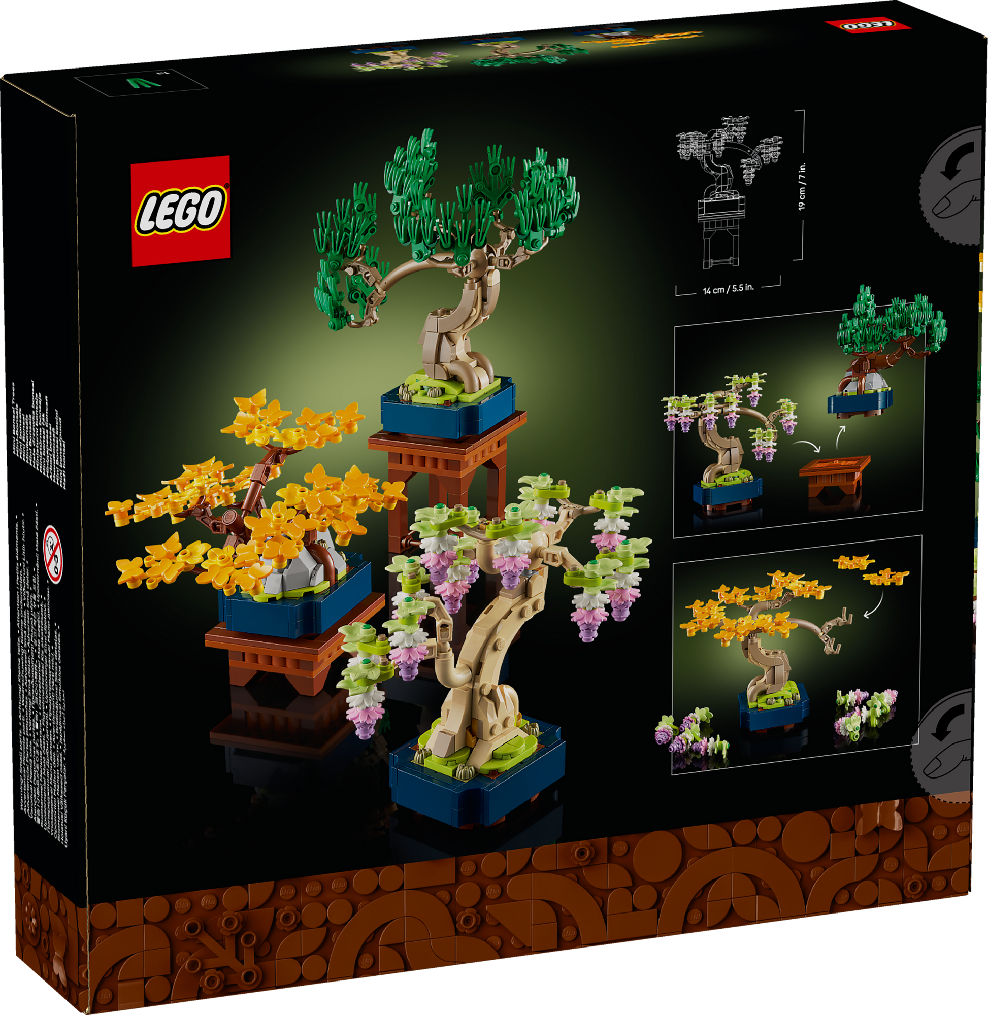 • Tree decor – The building kit includes a ginkgo bonsai tree with yellow leaves, a black pine bonsai tree with green needles and a wisteria bonsai tree with hanging lilac flowers