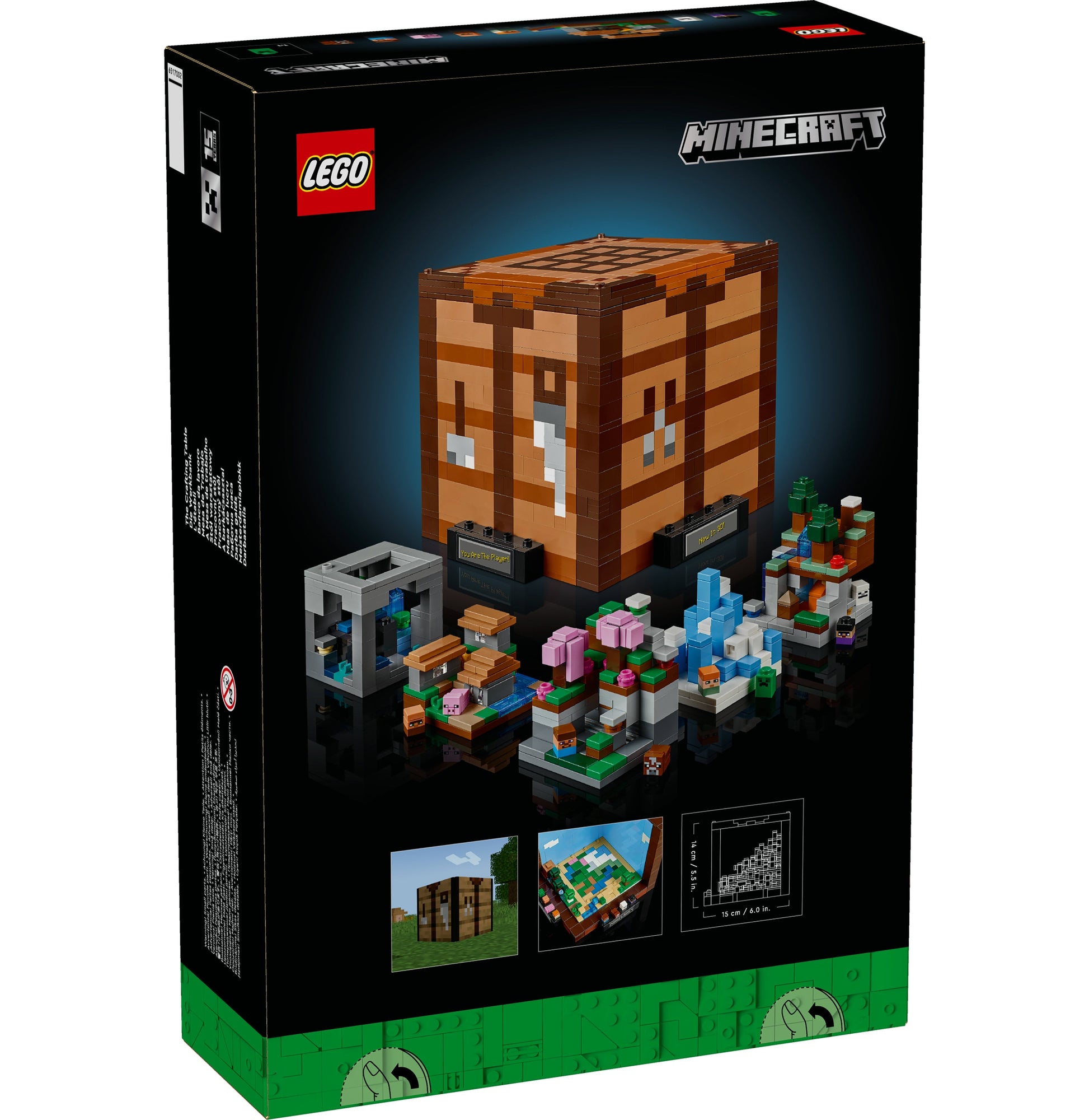 The set recreates the game’s iconic crafting table. Inside are 5 mini build modules featuring 12 Minecraft biomes, including the Taiga with a dripstone cave, Plains with a village, Ice Spikes with an igloo, Cherry Grove with an abandoned mineshaft, and the Deep Dark with a lush cave. 8 microfigures are also included: Steve, Alex, a skeleton, witch, Creeper™, villager, cow and pig. The mini builds and microfigures detach from the main model to enable a variety of display possibilities. Stickers featuring memorable in-game phrases can be added to the front of the Minecraft model. For convenience, a digital version of the set’s building instructions can also be found on the LEGO Builder app.
