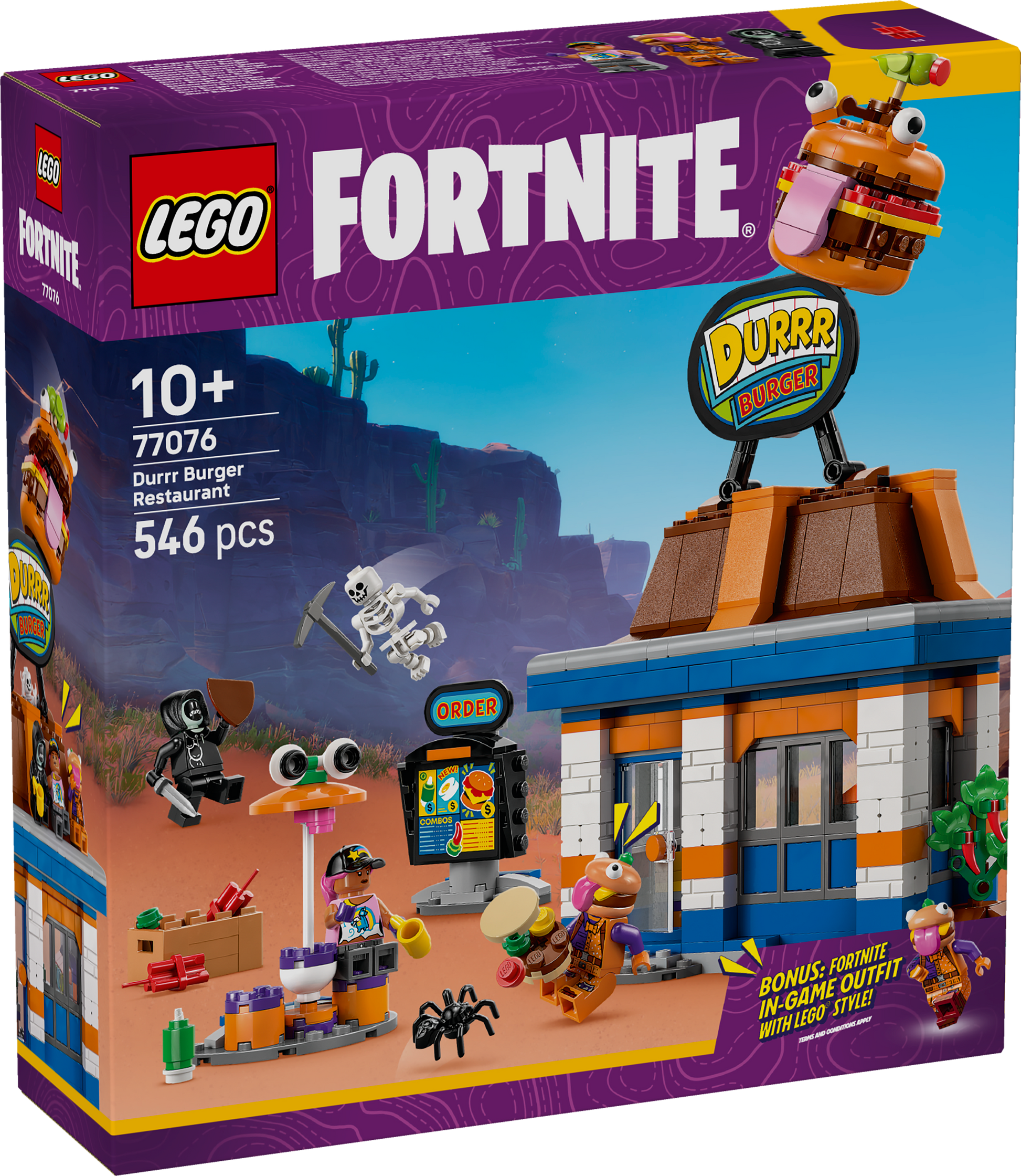 • Durrr Burger restaurant model – Feed imaginations with the LEGO® Fortnite® Durrr Burger Restaurant building set for kids aged 10 and over