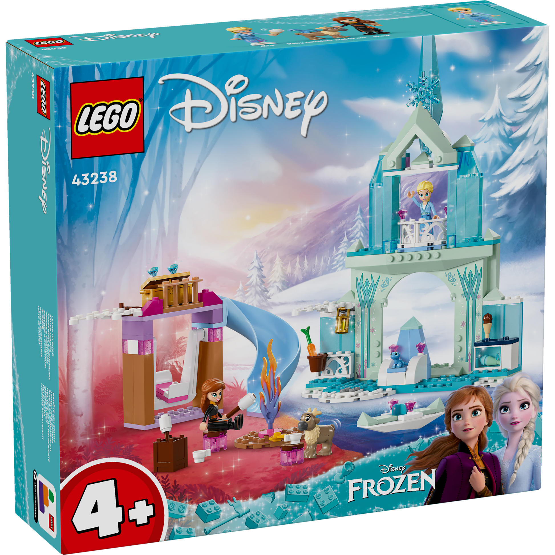Unlimited palace play awaits kids aged 4 and up as they learn to build with this LEGO® ǀ Disney Frozen Elsa’s Frozen Castle (43238) building toy. Inside is a castle with a kitchen, a fireplace, swing and slide area, a campfire, small ice canoe and lots of story starters. It includes Elsa and Anna LEGO ǀ Disney mini-doll figures plus Bruni and baby reindeer LEGO ǀ Disney animal figures.