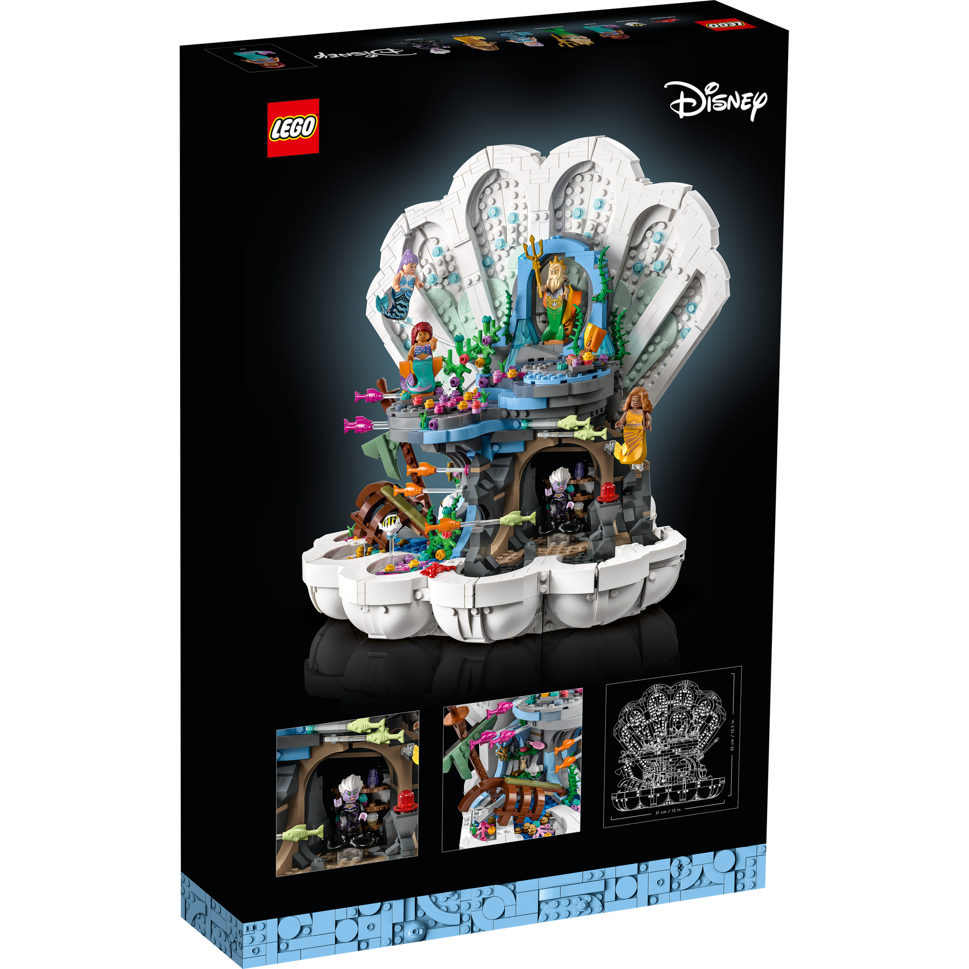 Share your love of Disney’s The Little Mermaid with this LEGO® | Disney The Little Mermaid Royal Clam Shell (43225) set. Based on the upcoming live-action The Little Mermaid film, this detailed, 1,808-piece set showcases 3 key areas: King Triton’s throne rock, Ariel’s hideout filled with treasures and Ursula’s mysterious cave – all in a unique shell designed for display.