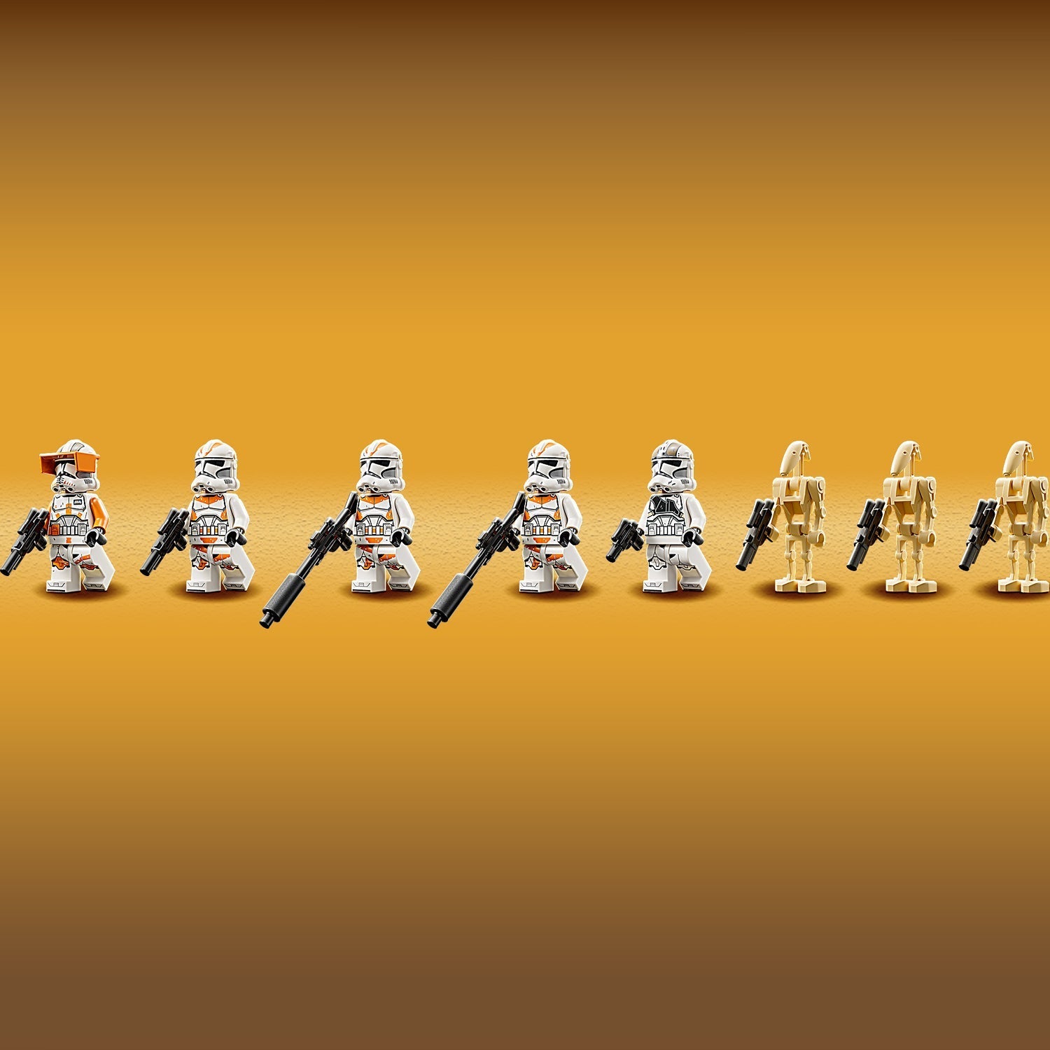 • 5 LEGO® minifigures and 3 LEGO droid figures – Commander Cody, a 212th Clone Gunner, 3 212th Clone Troopers and 3 Battle Droids, all with weapons, plus a buildable Dwarf Spider Droid