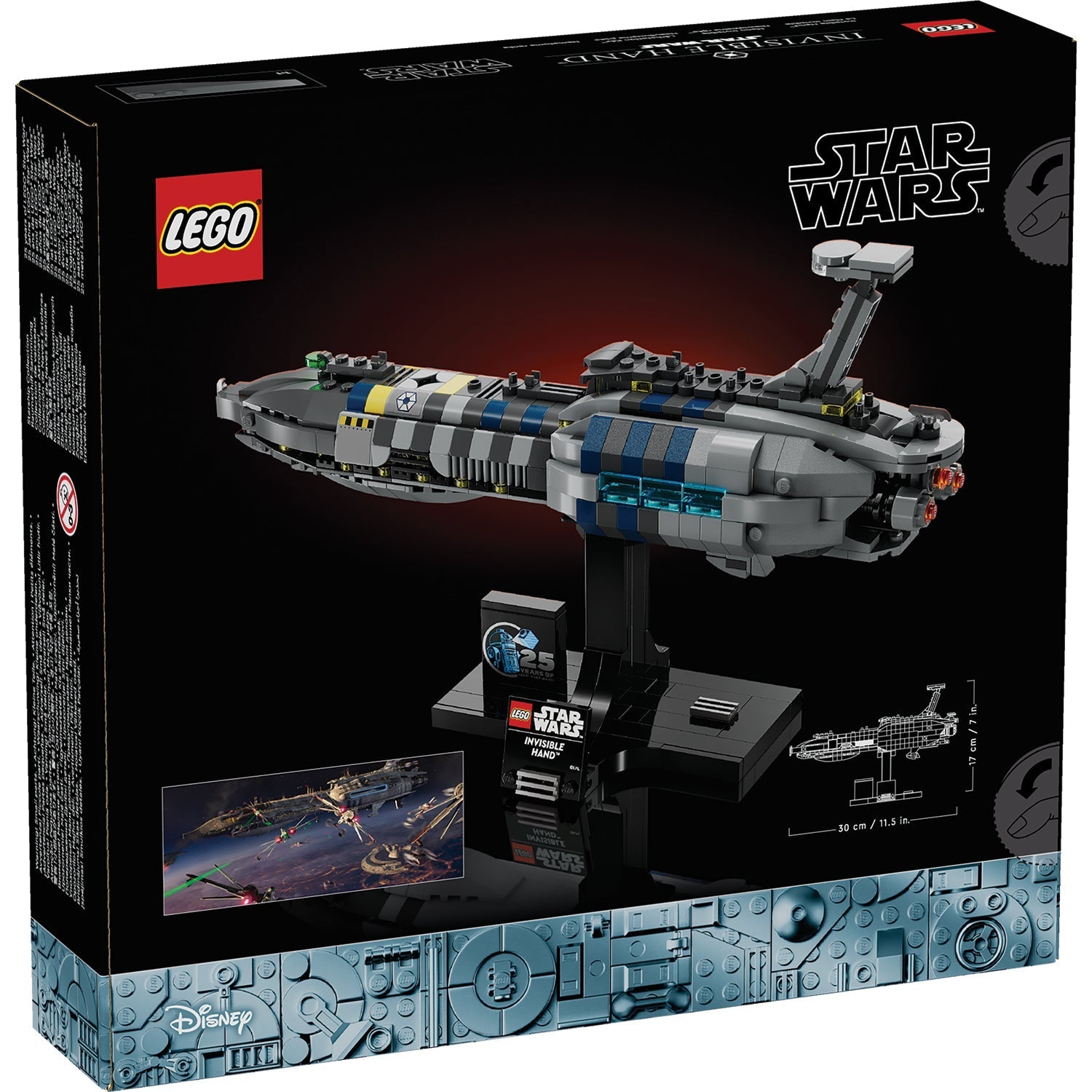 • Made for display – The buildable stand has a nameplate and LEGO® Star Wars™ 25th anniversary brick, and it’s designed to display the Invisible Hand starship