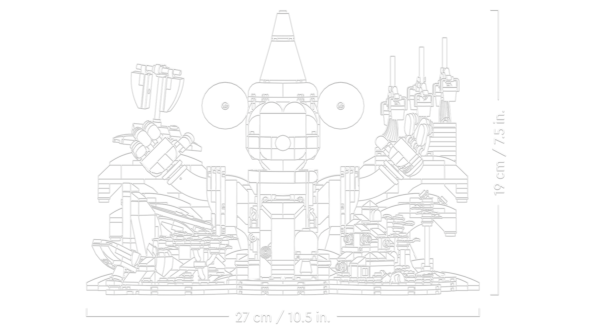 • Dimensions – This 1,103-piece LEGO® brick-built Disney model measures over 19 cm (7.5 in.) high, 27 cm (10.5 in.) wide and 17 cm (6.5 in.) deep