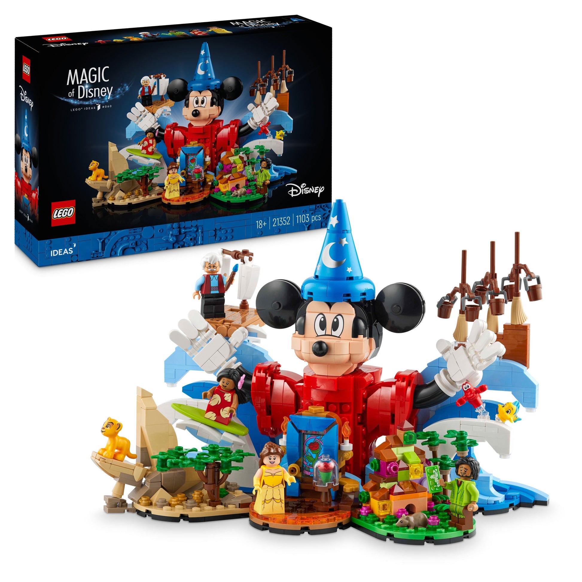 • Iconic Disney characters – A buildable Mickey Mouse figure, Belle, Geppetto, Bruno and Lilo minifigures, plus Simba, Sebastian, Flounder and 3 Broom figures