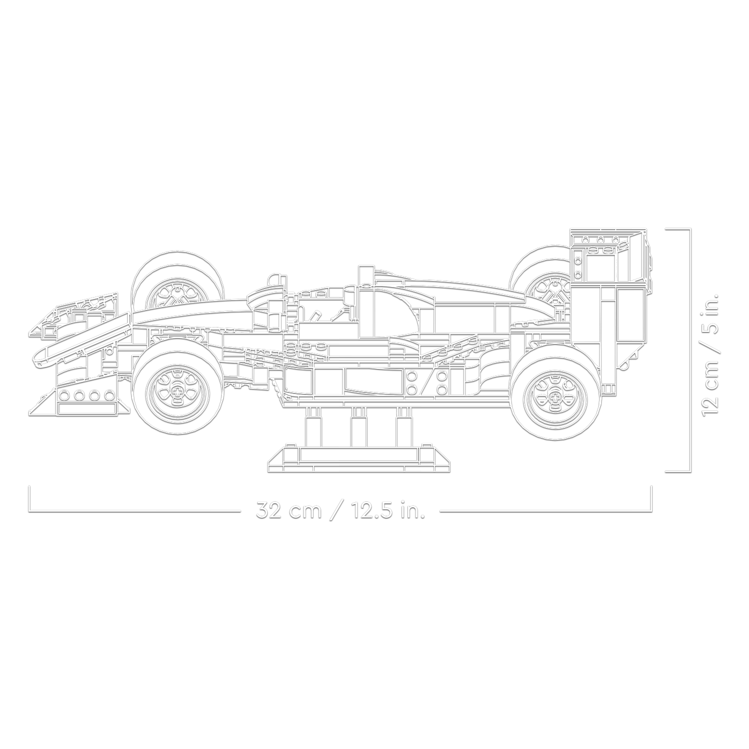 Dimensions – The McLaren MP4/4 racing car in this 693-piece LEGO® set measures over 12 cm (5 in.) high, 32 cm (12.5 in.) long and 17 cm (6.5 in.) wide