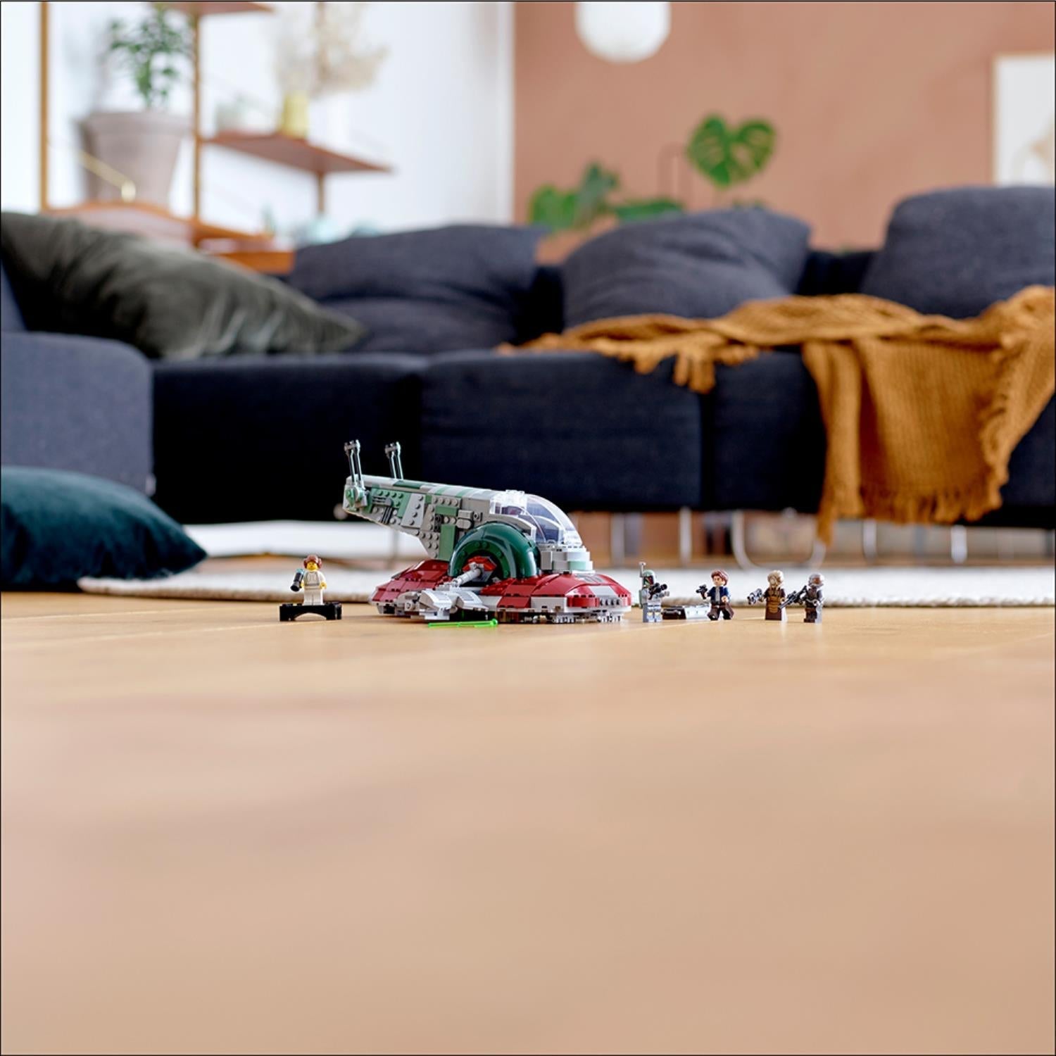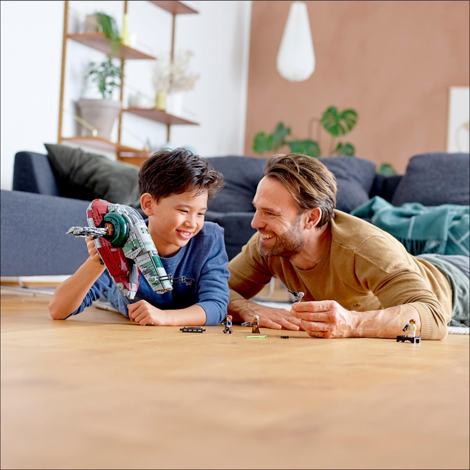• Slave I LEGO® Star Wars™ set features a detachable cockpit canopy with space for a minifigure inside, a self-leveling cockpit seat and side wings, a carry handle, separate triggers for the 2 spring-loaded shooters, rotating guns and a closing rear hatch to store the Han Solo in Carbonite element.
