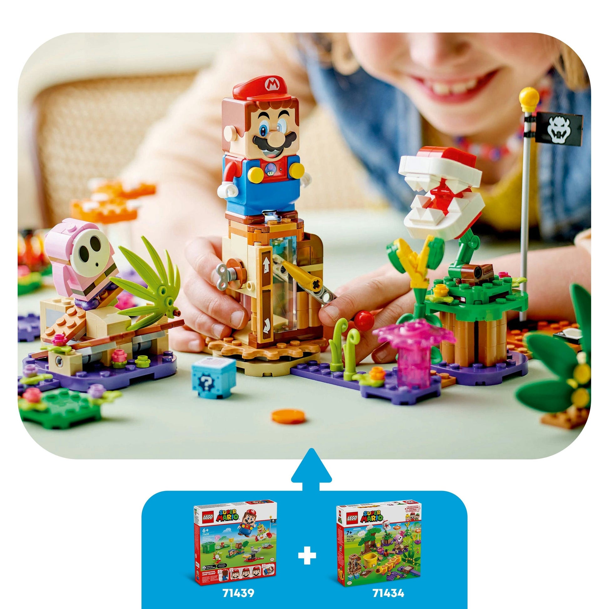 Add a LEGO® Mario™, LEGO® Luigi™ or LEGO® Peach™ figure (from sets 71439, 71440 or 71441 – sold separately) to this toy playset for interactive play. Earn digital coins for riding the Wiggler, toppling the Pink Shy Guy, crossing the poison swamp on the raft, and more.
